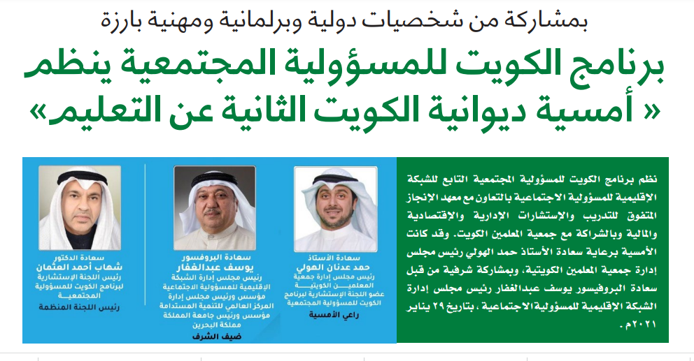 نظم برنامج الكويت للمسؤولية المجتمعية التابع للشبكة الإقليمية للمسؤولية الاجتماعية بالتعاون مع معهد الإنجاز المتفوق للتدريب والإستشارات الإدارية والإقتصادية والمالية وبالشراكة مع جمعية المعلمين الكويت. وقد كانت الأمسية برعاية سعادة الأستاذ حمد الهولي رئيس مجلس إدارة جمعية المعلمين الكويتية ، وبمشاركة شرفية من قبل سعادة البروفيسور يوسف عبدالغفار رئيس مجلس إدارة الشبكة الإقليمية للمسؤوليةالاجتماعية ، بتاريخ 29 يناير 2021م . وقد شارك في هذه الأمسية سعادة الدكتور طارق الشيخ مبعوث الأمين العام للأمم المتحدة المنسق المقيم لدى دولة الكويت ، وكذلك سعادة السيد غسان خوجة الممثل المقيم بمكتب البنك الدولي في الكويت ، إضافة إلى سعادة النائب حمد المطر عضو ورئيس اللجنة التعليمية بمجلس الأمة الكويتية، إضافة إلى شخصيات أكاديمية ومهنية رفيعة المستوى. وقد قد سعادة البروفيسور يوسف عبدالغفار رئيس مجلس إدارة الشبكة الإقليمية للمسؤولية الاجتماعية كلمة في حفل الإفتتاح قال فيها ” يشرفنا اليوم أن نشارككم في أمسية ديوانية الكويت لعام 2022م ، والتي ينظمها برنامج الكويت للمسؤولية المجتمعية التابع للشبكة الإقليمية للمسؤولية الاجتماعية وبالشراكة مع معهد الإنجاز المتفوق للتدريب والإستشارات الإدارية والإقتصادية والمالية وشركاء آخرين معتبرين، لمناقشة موضوع التعليم بصفته الوسيط لتشكيل مستقبل البشر ومجتمعاتهم . حيث أن معظم أدبيات التنمية تُجمع على أن التعليم هو قلب التنمية وصلبها ،وأن نجاح التنمية في أي مجتمع يعتمد كثيراً على نجاح النظام التعليمي في هذا المجتمع، والتعليم مفتاح التقدم وأداة النهضة ومصدر القوة في المجتمعات .ويعتبر التعليم والتنمية وجهين لعملة واحدة فمحورهما الإنسان وغايتهما بناء الإنسان وتنمية قدراته وطاقاته من اجل تحقيق تنمية مستدامة بكفاءة وعدالة تتسع فيها خيارات الحياة أمام الناس.ويعدّ التعليم من أهم روافد التنمية وعناصرها المختلفة فالمجتمع الذي يحسن تعليم وتأهيل أبنائه ويوفر الموارد البشرية القادرة على تشغيل وإدارة عناصر التنمية، يساهم في بناء مجتمع قوي سليم يسوده الأمن الاجتماعي والاستقرار السياسي والاقتصادي.فعملية التعليم والتعلم لهما ارتباط وثيق الصلة بالتنمية المستدامة وهي استثمار بالبشر وللبشر، وقد ساعدت بحوث اقتصاديات التعليم على تحول جذري في الفكر التنموي التعليمي الذي يركز جل اهتمامه على تنمية قدرات البشر واعتبار التعليم هو محور التنمية الحقيقة وأداة تنمية قدرات البشر .ولو وقفنا اليوم على واقع التعليم في العالم نجده يواجه تحديات كبيرة وخاصة في قارتي آسيا وأفريقيا. فتجسيد شعار “الحق في التعليم ” وهو الحق الذي تنص عليه صراحة المادة 26 من الإعلان العالمي لحقوق الإنسان ، والتي تدعو إلى التعليم الابتدائي المجاني والإلزامي. وتذهب اتفاقية حقوق الطفل، المعتمدة في عام 1989 أمرا ليس باليسير تحقيقه .بل حلم الذهاب ” إلى أبعد من ذلك ، حيث ينص ذات الإعلان على أن يتاح التعليم العالي أمام الجميع، أمر يحتاج جهود وتضامن دولي لتحويله من حلم إلى واقع.كذلك أقر المجتمع الدولي — عند تبنيه خطة التنمية المستدامة لعام 2030 في أيلول/سبتمبر 2015 — بأن التعليم ضروري لنجاح جميع أهداف الخطة السبعة عشر. ويهدف الهدف الرابع، على وجه الخصوص، إلى ’’ضمان توفير تعليم جيد وشامل وتعزيز فرص التعلم مدى الحياة للجميع‘‘ بحلول عام 2030. ومثل هذه الفعاليات التي تنظمونها ستساهم بالتأكيد في خلق حراك من الوعي المجتمعي المؤسسي، والذي سيعمل الجميع من خلاله على دعم تحقيق الهدف الرابع من أهداف التنمية المستدامة والمعني بالتعليم.ولو وقفنا عند بعض الإحصائيات والتي صدرت من منظمة الأمم المتحدة بمناسبة اليوم العالمي للتعليم لعام 2022م ، سنجد أنها صادمة .حيث ما يقرب من 265 مليون طفل ومراهق في العالم لا تتاح لهم الفرصة للدراسة أو حتى إكمالها، و617 مليون طفل ومراهق لا يستطيعون القراءة أو إجراء 