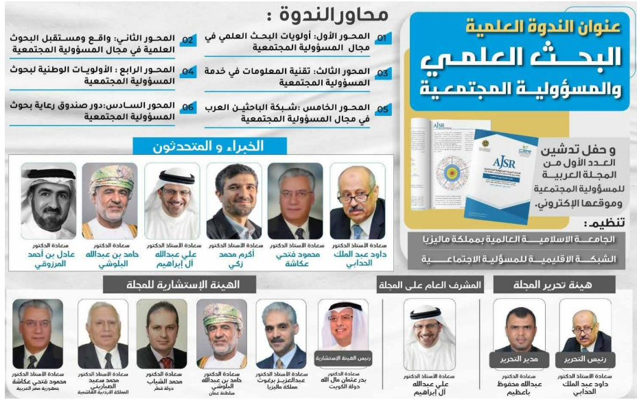 بشراكة مابين الشبكة الإقليمية للمسؤولية الاجتماعية والجامعة الإسلامية العالمية بمملكة ماليزيا، أقيمت فعاليات الندوة العلمية بعنوان” البحث العلمي والمسؤولية المجتمعية ” وكذلك حفل تدشين” أصدار العدد الاول من المجلة العربية للمسؤولية المجتمعية “أول مجلة علمية محكمة في مجال المسؤولية المجتمعية بالدول العربية”، بتاريخ 6 مايو 2023م . وشارك في هذا الندوة شخصيات علمية وأكاديمية من الدول العربية ومن خارجها. وتم خلال هذا الندوة العلمية أيضا الإعلان عن الهيئتين الإشرافية والتحريرية لهذه المجلة والتي تعد إنجازا علميا وإعلاميا للباحثين والمتخصصين في مجالات المسؤولية المجتمعية بالمنطقة العربية. علما أنه تم تمويل هذه المجلة العلمية بدعم ورعاية من ” الصندوق العربي لرعاية بحوث المسؤولية المجتمعية” التابع للشبكة الإقليمية للمسؤولية الاجتماعية