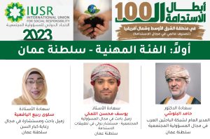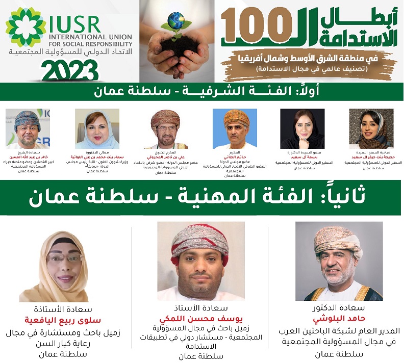 • أعلن الاتحاد الدولي للمسؤولية المجتمعية وخلال مراسم احتفالية رسمية عن ” أبطال الاستدامة المائة في منطقة الشرق الأوسط وشمال أفريقيا لعام 2023م “، وذلك استنادا إلى تصنيفه العالمي المعني بالاستدامة. وقد ضمت القائمة شخصيات كبيرة ومؤثرة من دول الشرق الأوسط وشمال أفريقيا . كما ضمت هذه القائمة شخصيات عمانية عرفها المجتمع العماني، إضافة إلى جهودها العابرة للحدود في مجال الاستدامة والممارسات المسؤولة. ومن أبرز الشخصيات العمانية التي ضمها هذه التصنيف العالمي في فئتيه الشرفية والمهنية، هم من الفئة الشرفية: صاحبة السمو السيدة حجيجة بنت جيفر ال سعيد السفير الدولي للمسؤولية المجتمعية، وسمو السيدة الدكتورة بسمة آل سعيد السفير الدولي للمسؤولية المجتمعية، والمكرم حاتم بن حمد الطائي عضو مجلس الدولة