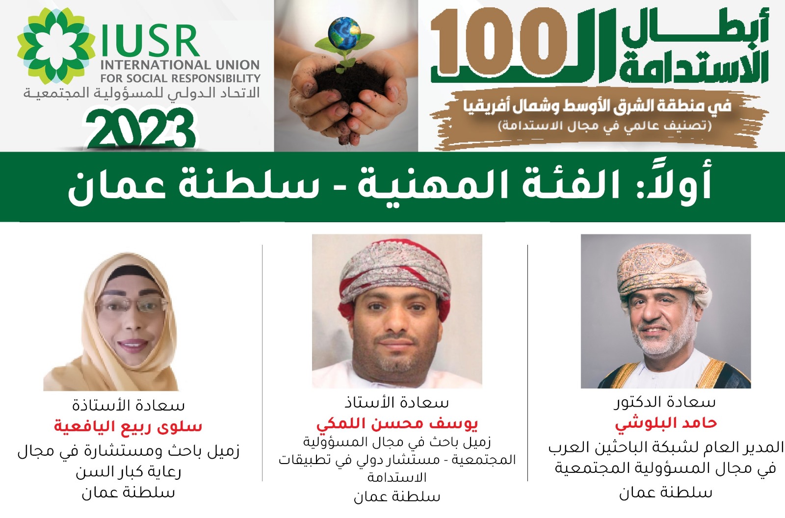 السفير الدولي للمسؤولية المجتمعية، إضافة إلى الشيخ المكرم علي بن ناصر المحروقي عضو مجلس الدولة عضو شرفي بالاتحاد الدولي للمسؤولية المجتمعية ومعالي الدكتورة سعاد بنت محمد بن سليمان اللواتية وزيرة شوون الفنون و نائبة رئيس مجلس الدولة (سابقاً )،والشيخ خالد بن عبد الله المسن خبير اقتصادي وعضو منصة الخبراء العرب في مجال المسؤولية المجتمعية.كذلك تم اختيار عدد من الشخصيات العمانية الأخرى ضمن فئة التصنيف المهني وهم: الدكتور حامد بن عبد الله البلوشي المدير العام لشبكة الباحثين العرب في مجال المسؤولية المجتمعية، والأستاذ يوسف محسن اللمكي زميل باحث في مجال المسؤولية المجتمعية ،والأستاذة سلوى ربيع اليافعية زميل باحث ومستشارة في مجال رعاية كبار السن.