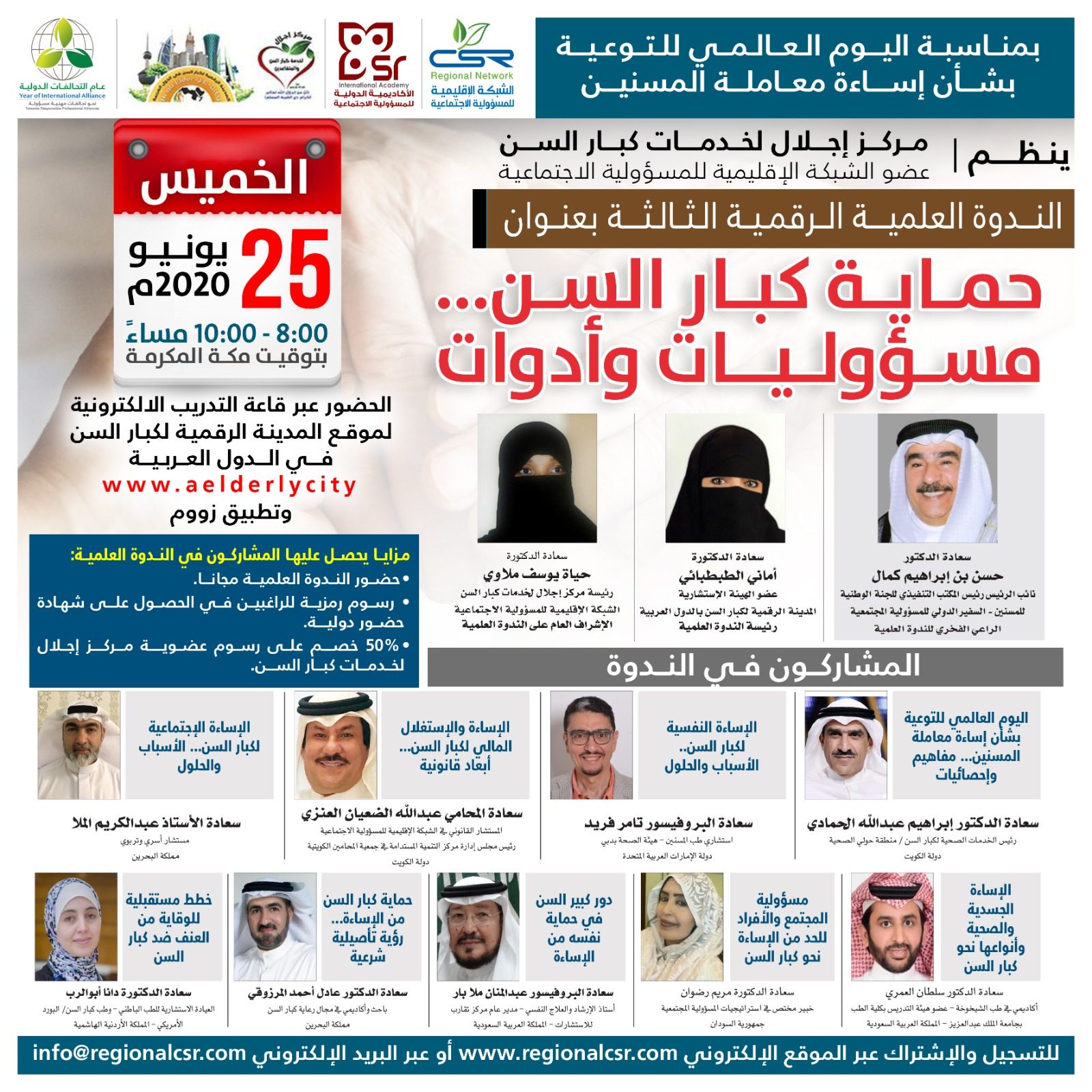 رئيسة مركز إجلال لخدمات كبار السن -المشرف العام على الندوة العلمية الرقمية- قالت فيه ، أنه هذه الندوة التي حرصنا أن ننظمها تفاعلا مع واجباتنا تجاه كبار السن ، واحتفاءا باليوم العالمي للتوعية بشأن إساءة معاملة المسنين، حيث شارك في هذه الندوة العلمية خبراء ومتحدثين متخصصين في مجالات رعاية كبار السن ، والذين تناولوا في أوراق عملهم محاور هامة منها:اليوم العالمي للتوعية بشأن إساءة معاملة المسنين… مفاهيم وإحصائيات ، والذي قدمه  سعادة الدكتور إبراهيم عبدالله الحمادي – رئيس الخدمات الصحية لكبار السن بمنطقة حولي الصحية من دولة الكويت . كما تناول محور “الإيذاء النفسي لكبار السن ..الأسباب والحلول ” سعادة البروفيسور تامر فريد  استشاري طب المسنين بهيئة الصحة بدبي  من دولة الإمارات العربية المتحدة.  وكذلك محور “الإساءة والإستغلال المالي لكبار السن… أبعاد قانونية” والذي تطرق اليه  سعادة الأستاذ عبدالله العنزي  المحامي والمستشار القانوني من دولة الكويت .أما محور “الإيذاء الإجتماعي لكبار السن …الأسباب والحلول ” فقد تناوله سعادة الأستاذ عبدالكريم الملا – مستشار أسري وتربوي من مملكة البحرين. ومحور الإساءة الجسدية والصحية وأنواعها نحو كبار السن ، تم التطرق اليه من قبل سعادة الدكتور سلطان العمري  الأكاديمي  في طب الشيخوخة – عضو هيئة التدريس بكلية الطب بجامعة الملك عبدالعزيز من المملكة العربية السعودية . ومحور “مسؤولية المجتمع والأفراد للحد من الإيذاء والإساءة نحو كبار السن ، حيث تناولته سعادة الدكتورة مريم رضوان الخبير المختص في استراتيجيات المسؤولية المجتمعية من جمهورية السودانً . كما تناول محور “دور كبير السن في حماية نفسه من الإيذاء  سعادة البروفيسور عبدالمنان ملا بار – أستاذ الإرشاد والعلاج النفسي – مدير عام مركز تقارب للاستشارات من  المملكة العربية السعودية ).