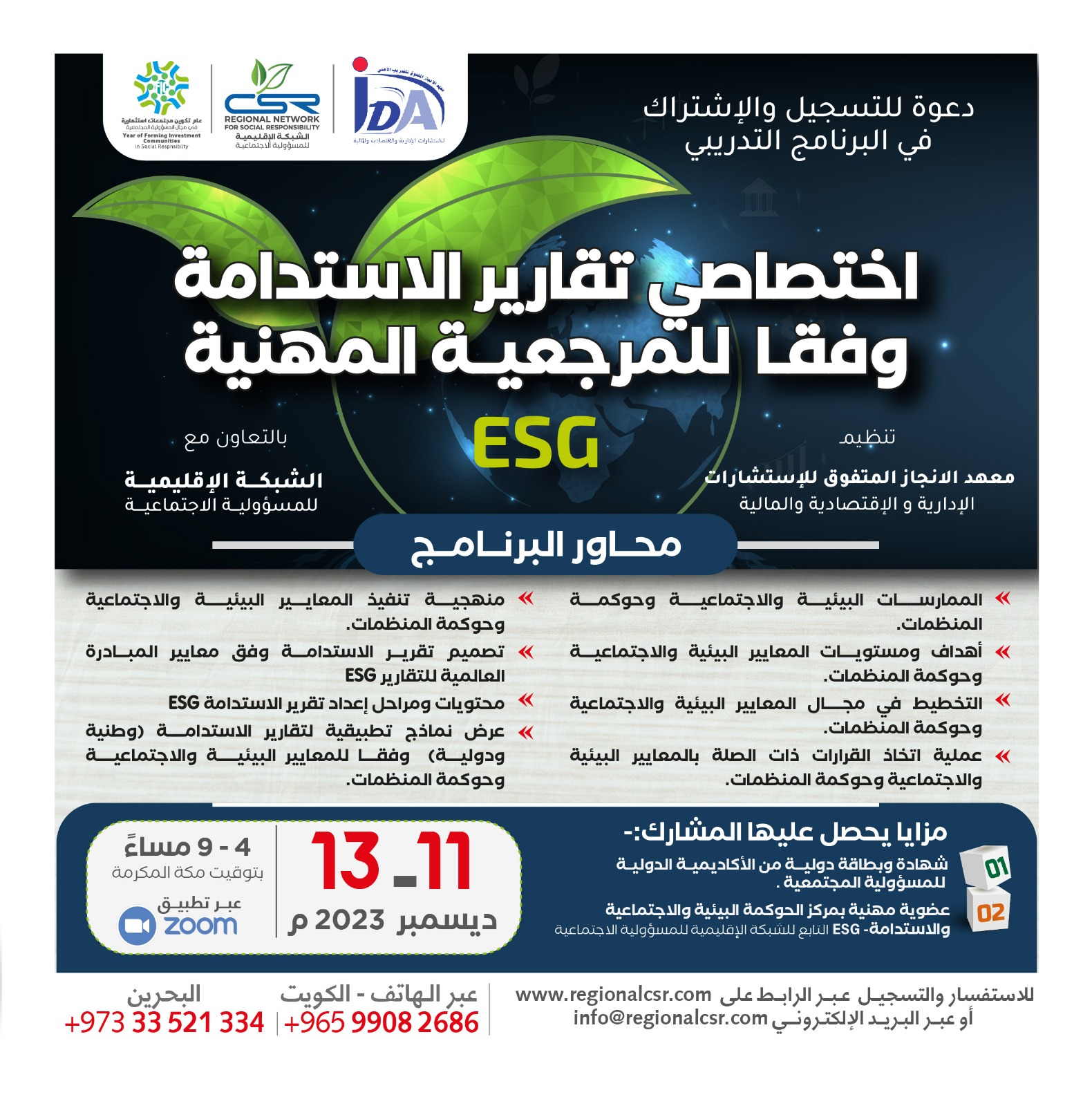- عرض نماذج تطبيقية لتقارير الاستدامة (وطنية ودولية) وفقا للمعايير البيئية والاجتماعية وحوكمة المنظمات.